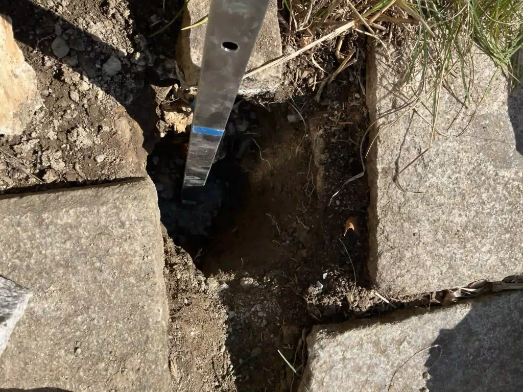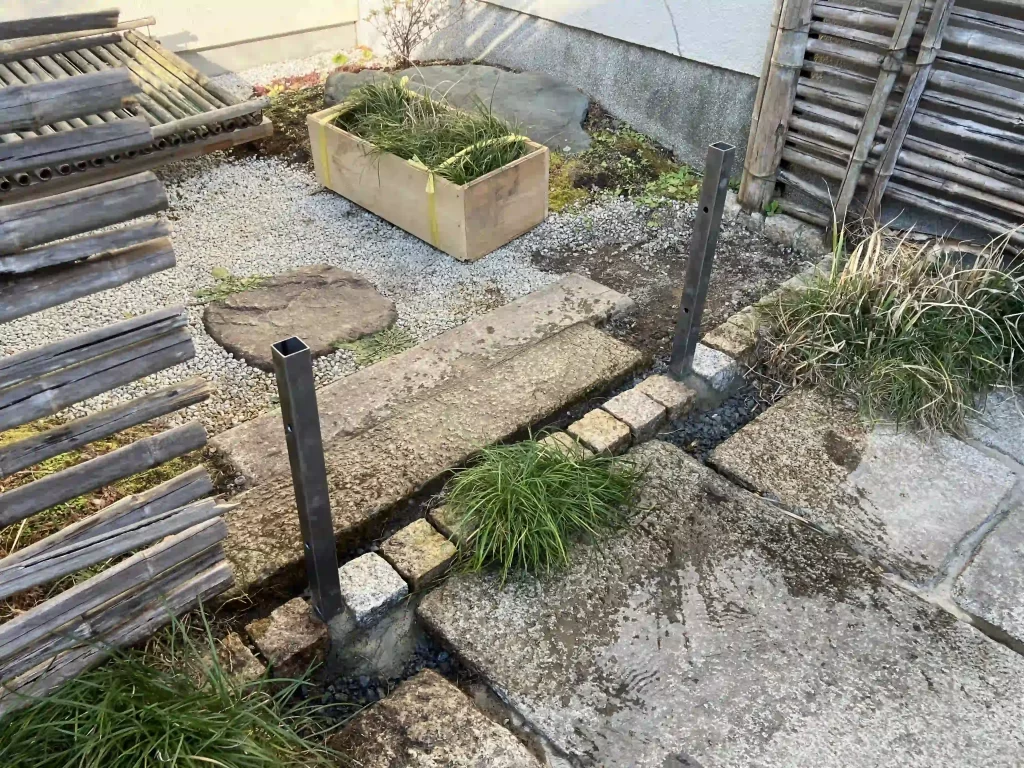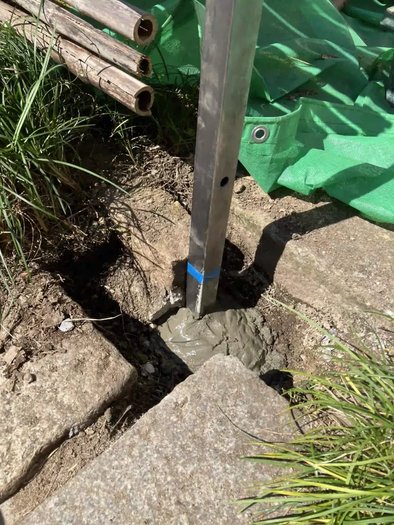 扉を支えている丸太支柱の根元が腐っていたので、撤去した後、鉄骨の基礎を埋め込む。