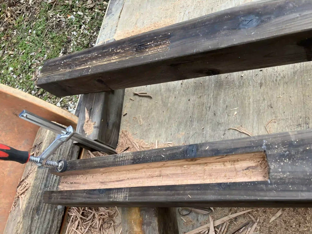 今回の柱は角材を使うことにした。鉄骨が入る溝を加工。