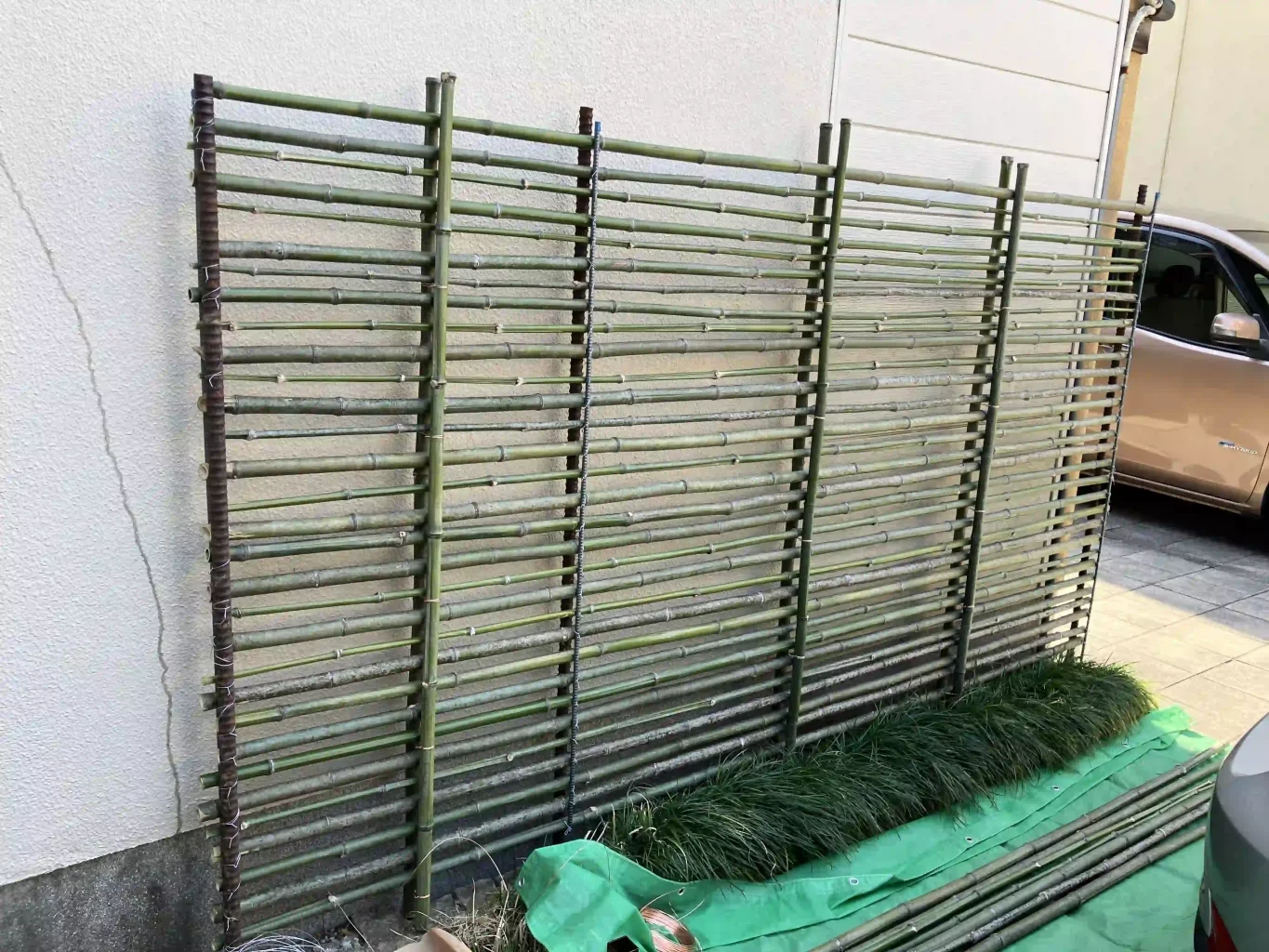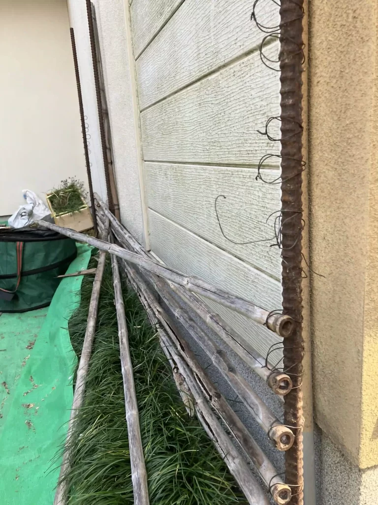 今回は、鉄筋支柱のところで細い鉄筋を使い、竹を挟み込むことで針金による結束の手間を少しだけ省けるか試みた。しかし、隙間を空けようということなら結局ある程度の結束の手間は必要だ。