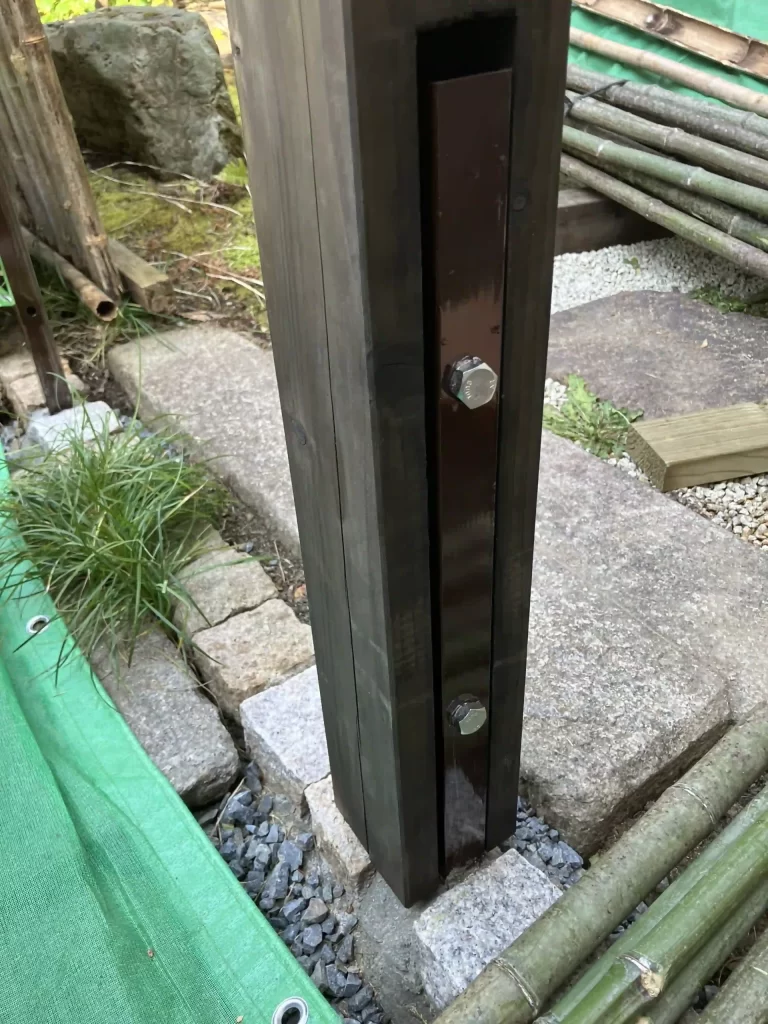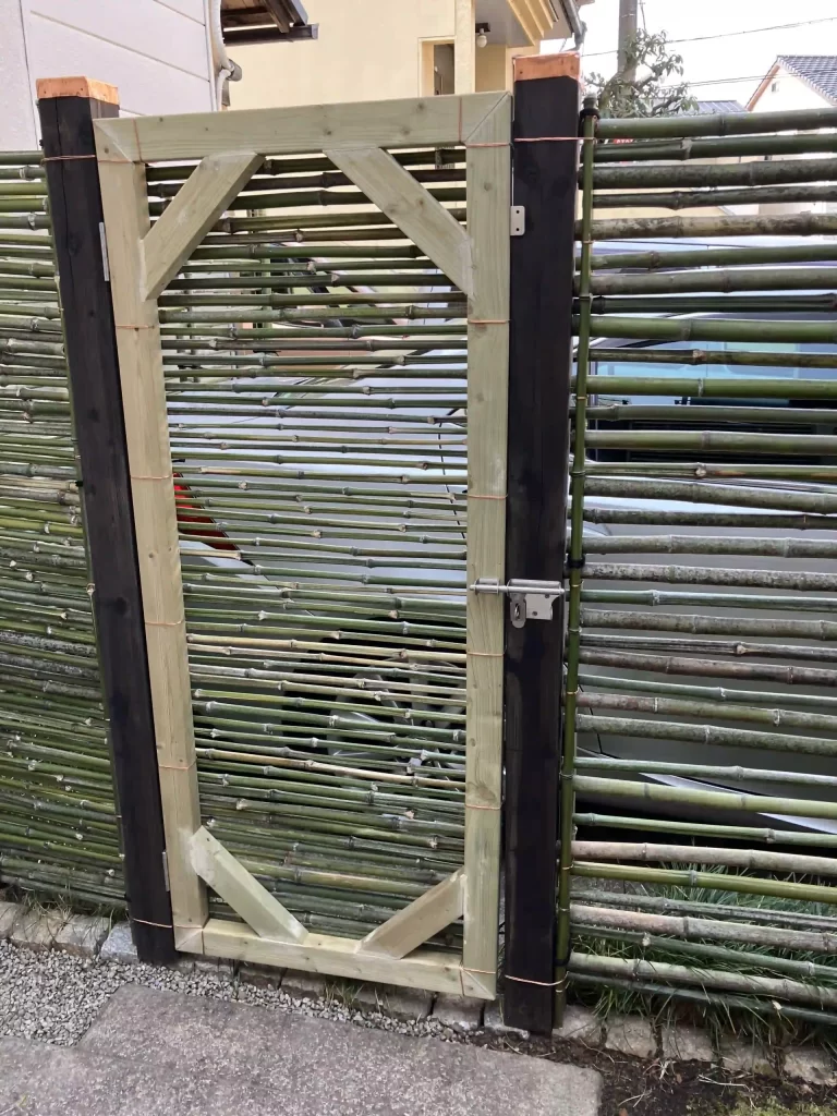 鉄筋支柱の部分に半割の竹を被せ、扉を取り付ける。